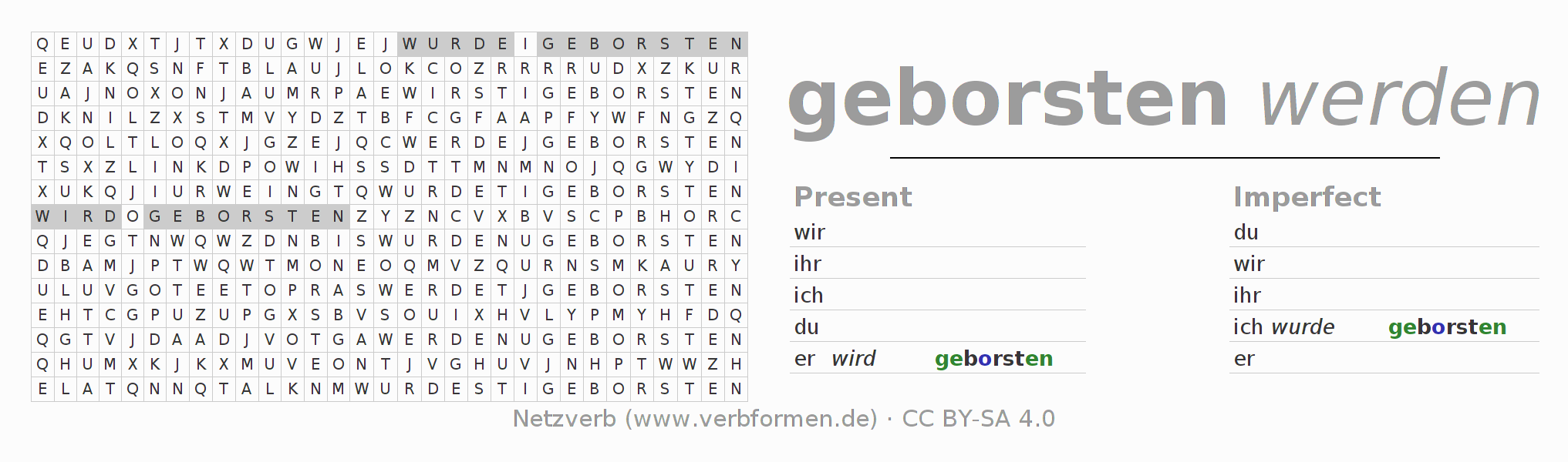 The word search puzzle for bersten or short word search is used to playfully learn German conjugation. First of all, the individual verb forms of the verb bersten must be created in order to find them in the letter grid. The reverse way is also possible. If one finds a flected verb in the search word puzzle, it is necessary to find out which verb form can be assigned. For printing and downloading, there is a PDF version or an image. There are also many more worksheets for the verb bersten. All materials are available as Open Educational Resources (OER) under license CC BY- SA 4.0 and can be used free of charge.