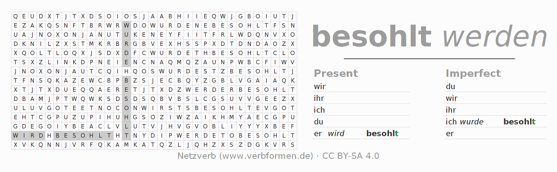 The word search puzzle for besohlen or short word search is used to playfully learn German conjugation. First of all, the individual verb forms of the verb besohlen must be created in order to find them in the letter grid. The reverse way is also possible. If one finds a flected verb in the search word puzzle, it is necessary to find out which verb form can be assigned. For printing and downloading, there is a PDF version or an image. There are also many more worksheets for the verb besohlen. All materials are available as Open Educational Resources (OER) under license CC BY- SA 4.0 and can be used free of charge.