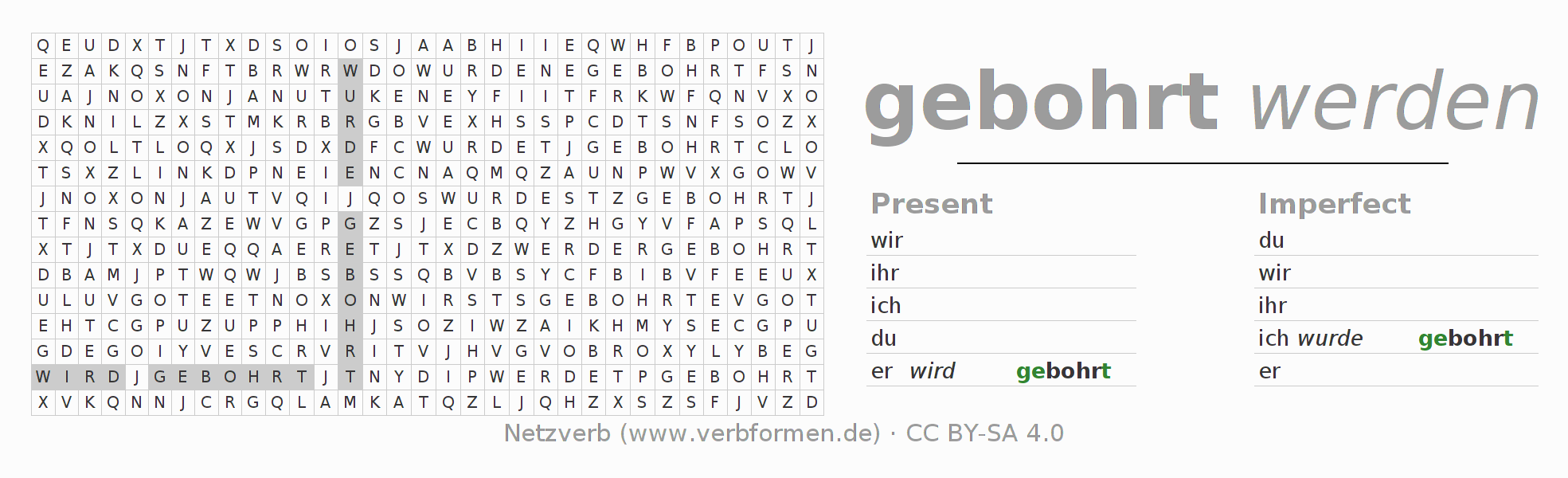 The word search puzzle for bohren or short word search is used to playfully learn German conjugation. First of all, the individual verb forms of the verb bohren must be created in order to find them in the letter grid. The reverse way is also possible. If one finds a flected verb in the search word puzzle, it is necessary to find out which verb form can be assigned. For printing and downloading, there is a PDF version or an image. There are also many more worksheets for the verb bohren. All materials are available as Open Educational Resources (OER) under license CC BY- SA 4.0 and can be used free of charge.