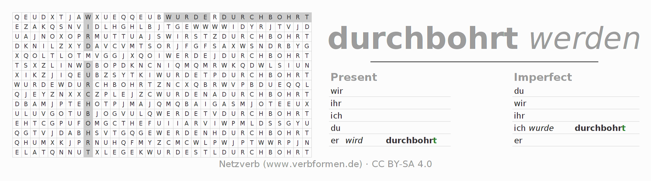 The word search puzzle for durchbohren or short word search is used to playfully learn German conjugation. First of all, the individual verb forms of the verb durchbohren must be created in order to find them in the letter grid. The reverse way is also possible. If one finds a flected verb in the search word puzzle, it is necessary to find out which verb form can be assigned. For printing and downloading, there is a PDF version or an image. There are also many more worksheets for the verb durchbohren. All materials are available as Open Educational Resources (OER) under license CC BY- SA 4.0 and can be used free of charge.