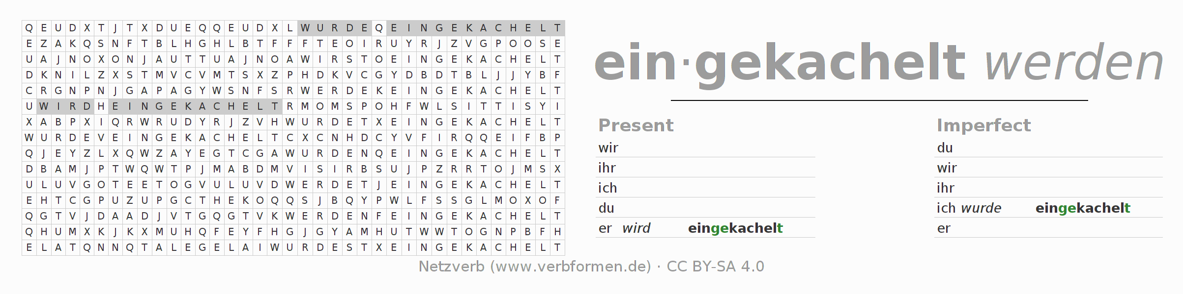 Instruction: Form the verb einkacheln and find it in the puzzle. Or recognize the flected form of einkacheln in the riddle and assign it to the correct verb form. Umlauts and ß are described as oe, ae and ue an ss.The solution is at the bottom of the page.