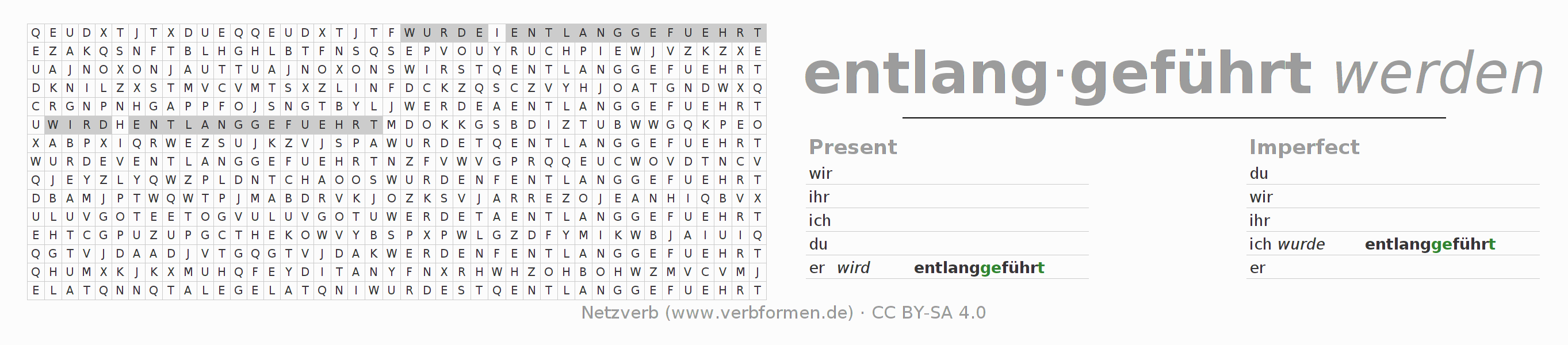 The word search puzzle for entlangführen or short word search is used to playfully learn German conjugation. First of all, the individual verb forms of the verb entlangführen must be created in order to find them in the letter grid. The reverse way is also possible. If one finds a flected verb in the search word puzzle, it is necessary to find out which verb form can be assigned. For printing and downloading, there is a PDF version or an image. There are also many more worksheets for the verb entlangführen. All materials are available as Open Educational Resources (OER) under license CC BY- SA 4.0 and can be used free of charge.