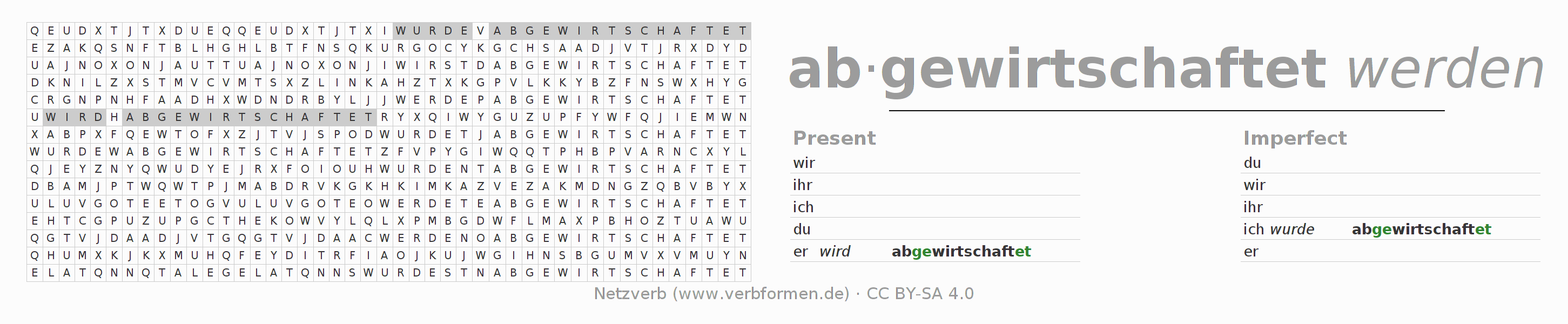 Word search puzzle for the conjugation of the German verb abwirtschaften