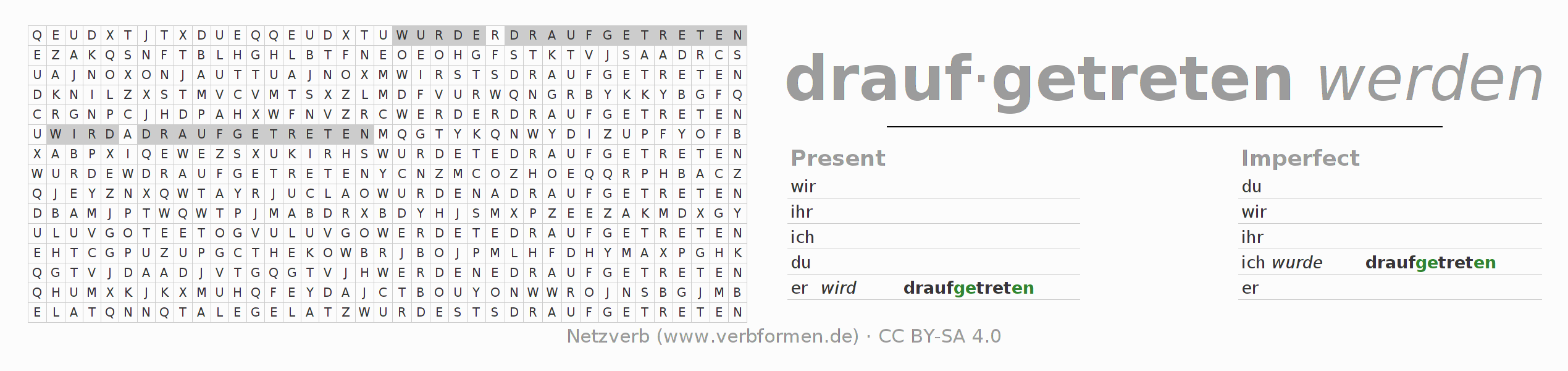 Instruction: Form the verb drauftreten and find it in the puzzle. Or recognize the flected form of drauftreten in the riddle and assign it to the correct verb form. Umlauts and ß are described as oe, ae and ue an ss.The solution is at the bottom of the page.