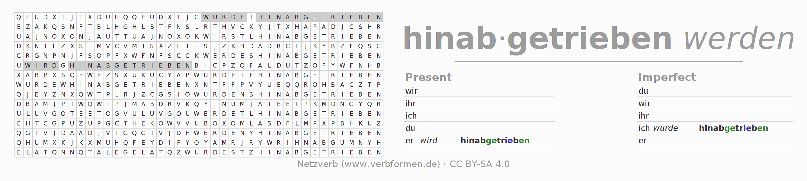 The word search puzzle for hinabtreiben or short word search is used to playfully learn German conjugation. First of all, the individual verb forms of the verb hinabtreiben must be created in order to find them in the letter grid. The reverse way is also possible. If one finds a flected verb in the search word puzzle, it is necessary to find out which verb form can be assigned. For printing and downloading, there is a PDF version or an image. There are also many more worksheets for the verb hinabtreiben. All materials are available as Open Educational Resources (OER) under license CC BY- SA 4.0 and can be used free of charge.