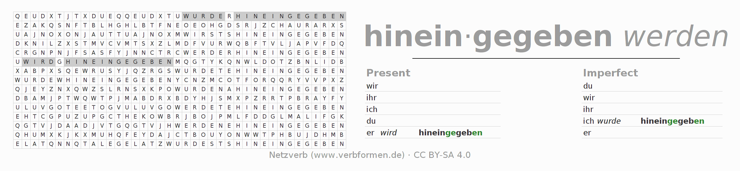 The word search puzzle for hineingeben or short word search is used to playfully learn German conjugation. First of all, the individual verb forms of the verb hineingeben must be created in order to find them in the letter grid. The reverse way is also possible. If one finds a flected verb in the search word puzzle, it is necessary to find out which verb form can be assigned. For printing and downloading, there is a PDF version or an image. There are also many more worksheets for the verb hineingeben. All materials are available as Open Educational Resources (OER) under license CC BY- SA 4.0 and can be used free of charge.