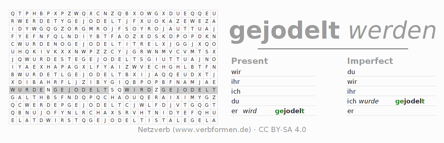 The word search puzzle for jodeln or short word search is used to playfully learn German conjugation. First of all, the individual verb forms of the verb jodeln must be created in order to find them in the letter grid. The reverse way is also possible. If one finds a flected verb in the search word puzzle, it is necessary to find out which verb form can be assigned. For printing and downloading, there is a PDF version or an image. There are also many more worksheets for the verb jodeln. All materials are available as Open Educational Resources (OER) under license CC BY- SA 4.0 and can be used free of charge.