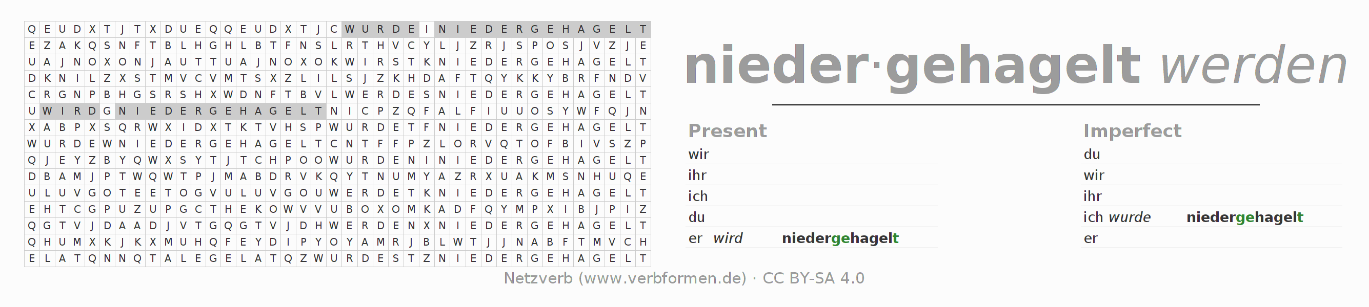 Word search puzzle for the conjugation of the German verb niederhageln