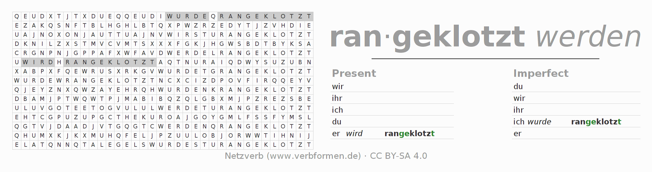 The word search puzzle for ranklotzen or short word search is used to playfully learn German conjugation. First of all, the individual verb forms of the verb ranklotzen must be created in order to find them in the letter grid. The reverse way is also possible. If one finds a flected verb in the search word puzzle, it is necessary to find out which verb form can be assigned. For printing and downloading, there is a PDF version or an image. There are also many more worksheets for the verb ranklotzen. All materials are available as Open Educational Resources (OER) under license CC BY- SA 4.0 and can be used free of charge.