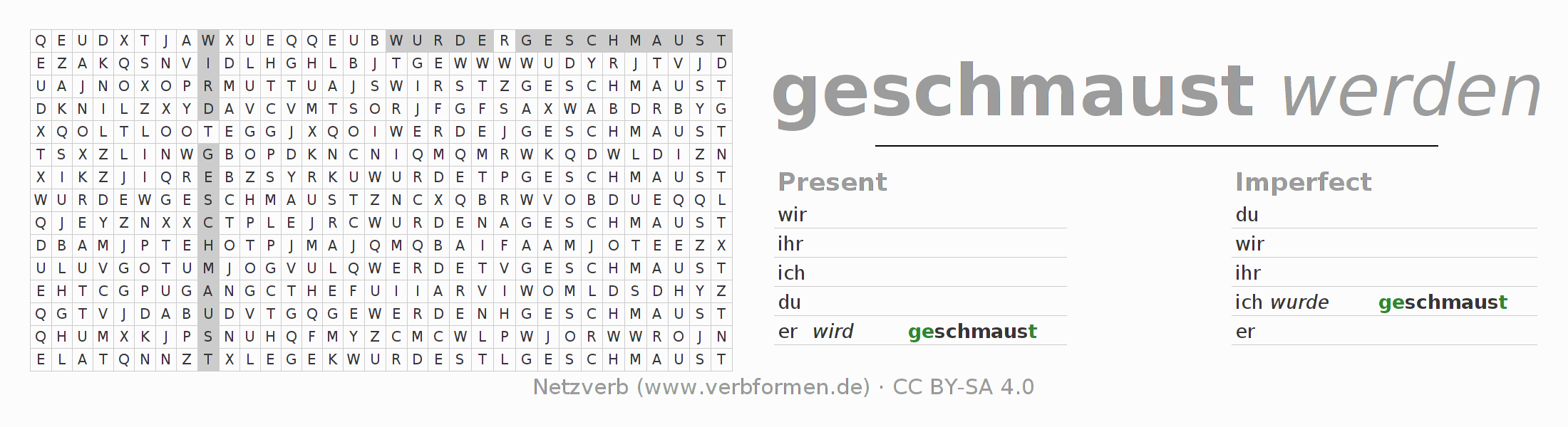The word search puzzle for schmausen or short word search is used to playfully learn German conjugation. First of all, the individual verb forms of the verb schmausen must be created in order to find them in the letter grid. The reverse way is also possible. If one finds a flected verb in the search word puzzle, it is necessary to find out which verb form can be assigned. For printing and downloading, there is a PDF version or an image. There are also many more worksheets for the verb schmausen. All materials are available as Open Educational Resources (OER) under license CC BY- SA 4.0 and can be used free of charge.