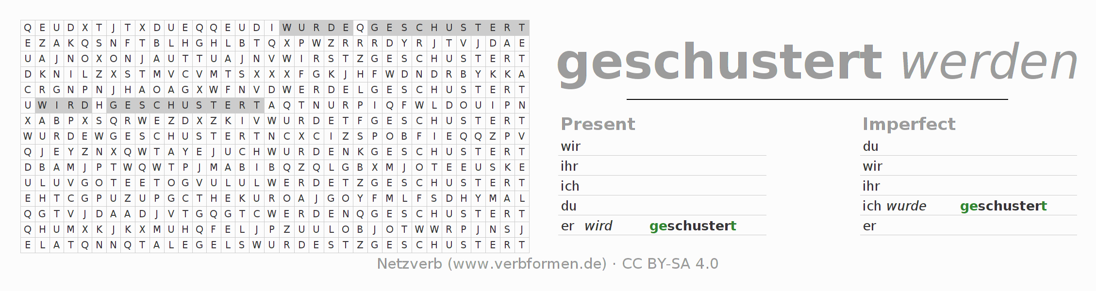 Instruction: Form the verb schustern and find it in the puzzle. Or recognize the flected form of schustern in the riddle and assign it to the correct verb form. Umlauts and ß are described as oe, ae and ue an ss.The solution is at the bottom of the page.