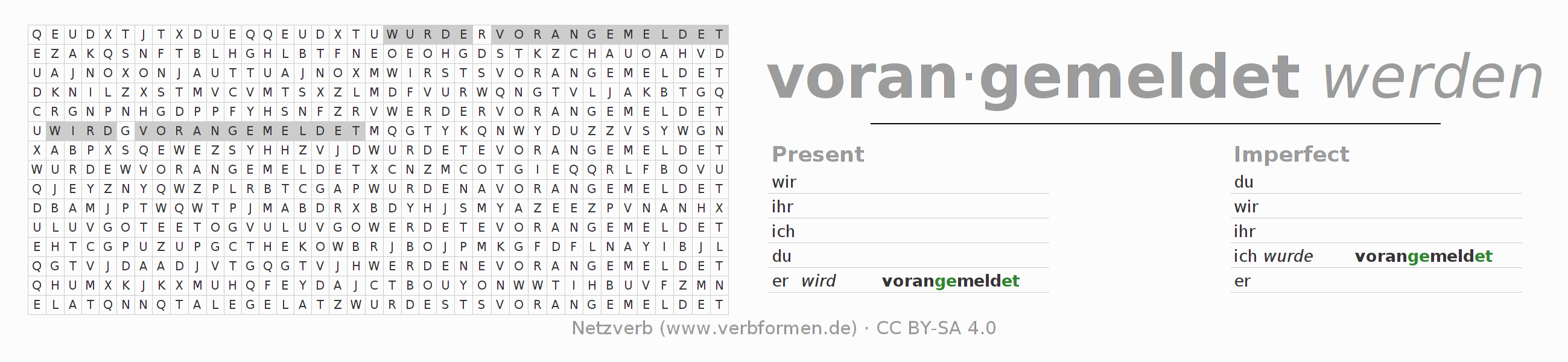 The word search puzzle for voranmelden or short word search is used to playfully learn German conjugation. First of all, the individual verb forms of the verb voranmelden must be created in order to find them in the letter grid. The reverse way is also possible. If one finds a flected verb in the search word puzzle, it is necessary to find out which verb form can be assigned. For printing and downloading, there is a PDF version or an image. There are also many more worksheets for the verb voranmelden. All materials are available as Open Educational Resources (OER) under license CC BY- SA 4.0 and can be used free of charge.