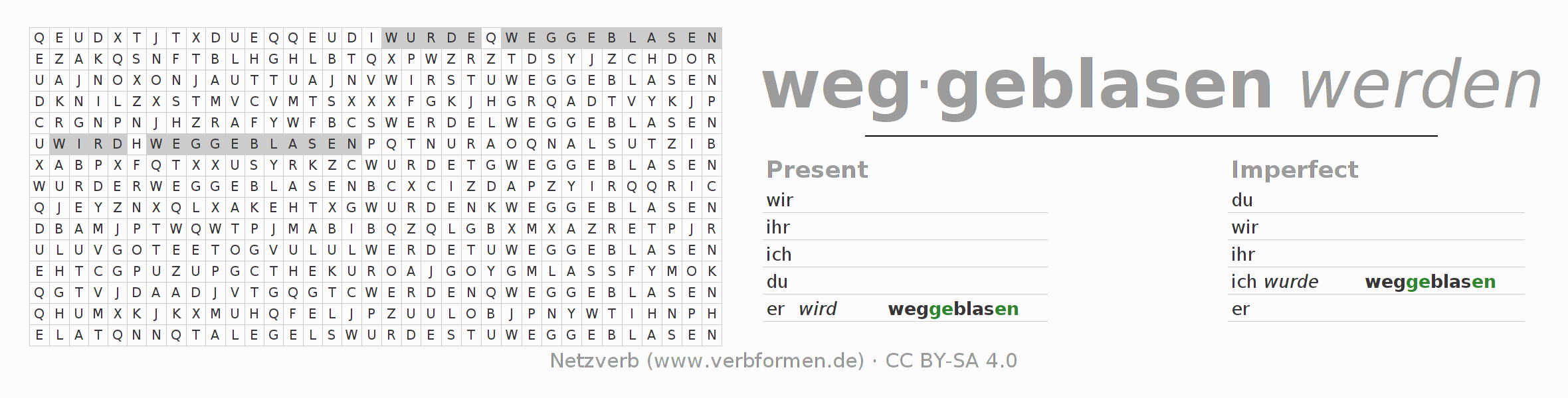 The word search puzzle for wegblasen or short word search is used to playfully learn German conjugation. First of all, the individual verb forms of the verb wegblasen must be created in order to find them in the letter grid. The reverse way is also possible. If one finds a flected verb in the search word puzzle, it is necessary to find out which verb form can be assigned. For printing and downloading, there is a PDF version or an image. There are also many more worksheets for the verb wegblasen. All materials are available as Open Educational Resources (OER) under license CC BY- SA 4.0 and can be used free of charge.