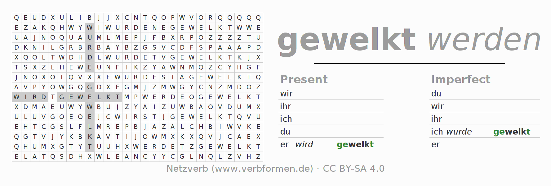 The word search puzzle for welken or short word search is used to playfully learn German conjugation. First of all, the individual verb forms of the verb welken (hat) must be created in order to find them in the letter grid. The reverse way is also possible. If one finds a flected verb in the search word puzzle, it is necessary to find out which verb form can be assigned. For printing and downloading, there is a PDF version or an image. There are also many more worksheets for the verb welken. All materials are available as Open Educational Resources (OER) under license CC BY- SA 4.0 and can be used free of charge.