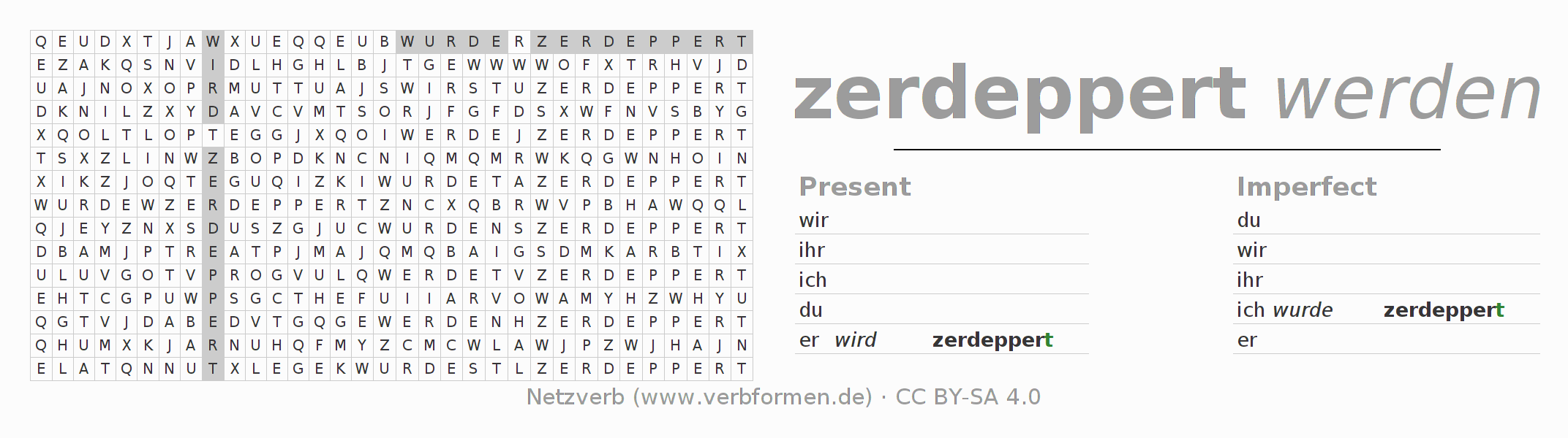 The word search puzzle for zerdeppern or short word search is used to playfully learn German conjugation. First of all, the individual verb forms of the verb zerdeppern must be created in order to find them in the letter grid. The reverse way is also possible. If one finds a flected verb in the search word puzzle, it is necessary to find out which verb form can be assigned. For printing and downloading, there is a PDF version or an image. There are also many more worksheets for the verb zerdeppern. All materials are available as Open Educational Resources (OER) under license CC BY- SA 4.0 and can be used free of charge.
