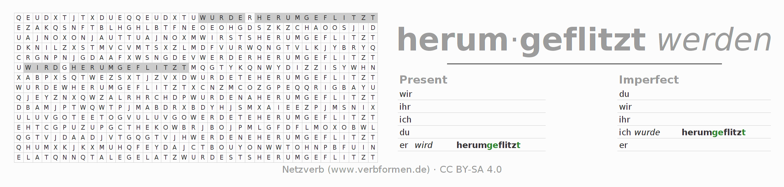 The word search puzzle for herumflitzen or short word search is used to playfully learn German conjugation. First of all, the individual verb forms of the verb herumflitzen must be created in order to find them in the letter grid. The reverse way is also possible. If one finds a flected verb in the search word puzzle, it is necessary to find out which verb form can be assigned. For printing and downloading, there is a PDF version or an image. There are also many more worksheets for the verb herumflitzen. All materials are available as Open Educational Resources (OER) under license CC BY- SA 4.0 and can be used free of charge.