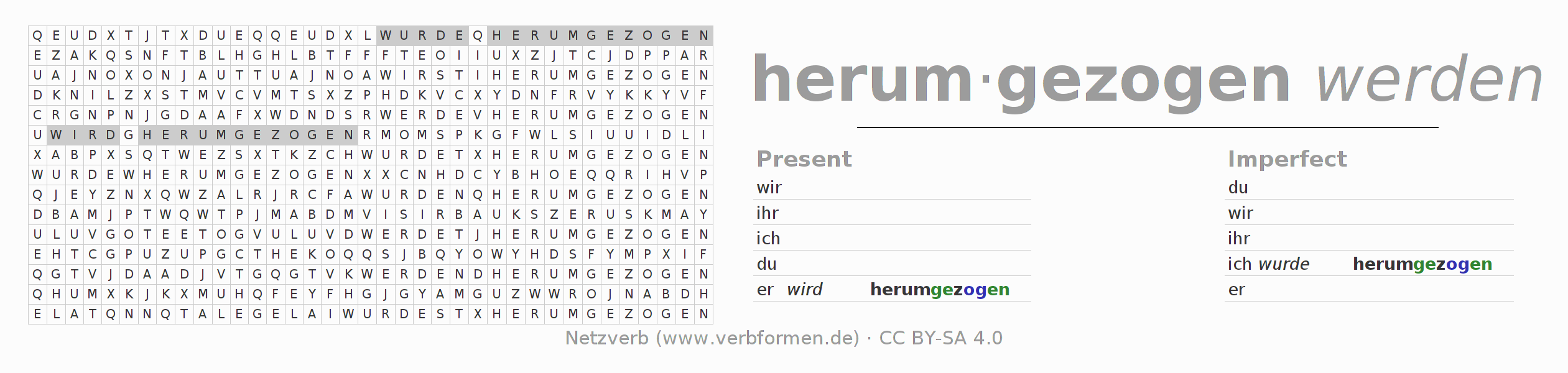 The word search puzzle for herumziehen or short word search is used to playfully learn German conjugation. First of all, the individual verb forms of the verb herumziehen (hat) must be created in order to find them in the letter grid. The reverse way is also possible. If one finds a flected verb in the search word puzzle, it is necessary to find out which verb form can be assigned. For printing and downloading, there is a PDF version or an image. There are also many more worksheets for the verb herumziehen. All materials are available as Open Educational Resources (OER) under license CC BY- SA 4.0 and can be used free of charge.