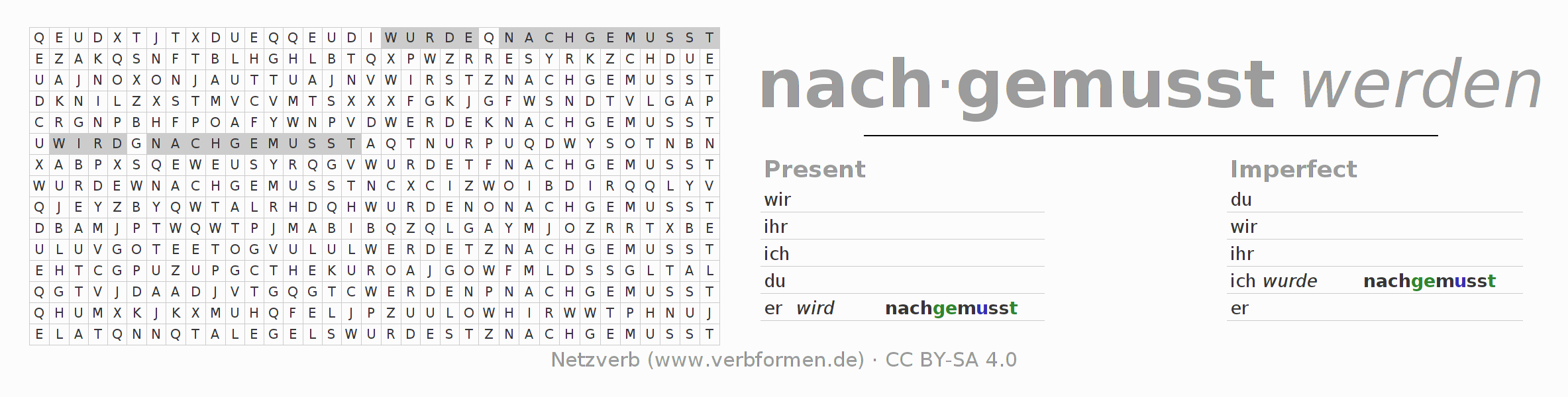 Instruction: Form the verb nachmüssen and find it in the puzzle. Or recognize the flected form of nachmüssen in the riddle and assign it to the correct verb form. Umlauts and ß are described as oe, ae and ue an ss.The solution is at the bottom of the page.