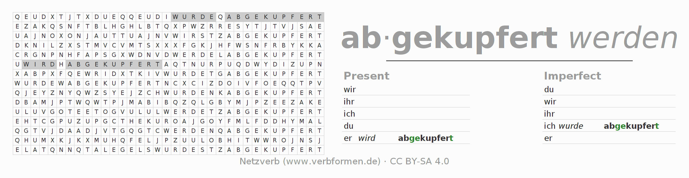The word search puzzle for abkupfern or short word search is used to playfully learn German conjugation. First of all, the individual verb forms of the verb abkupfern must be created in order to find them in the letter grid. The reverse way is also possible. If one finds a flected verb in the search word puzzle, it is necessary to find out which verb form can be assigned. For printing and downloading, there is a PDF version or an image. There are also many more worksheets for the verb abkupfern. All materials are available as Open Educational Resources (OER) under license CC BY- SA 4.0 and can be used free of charge.