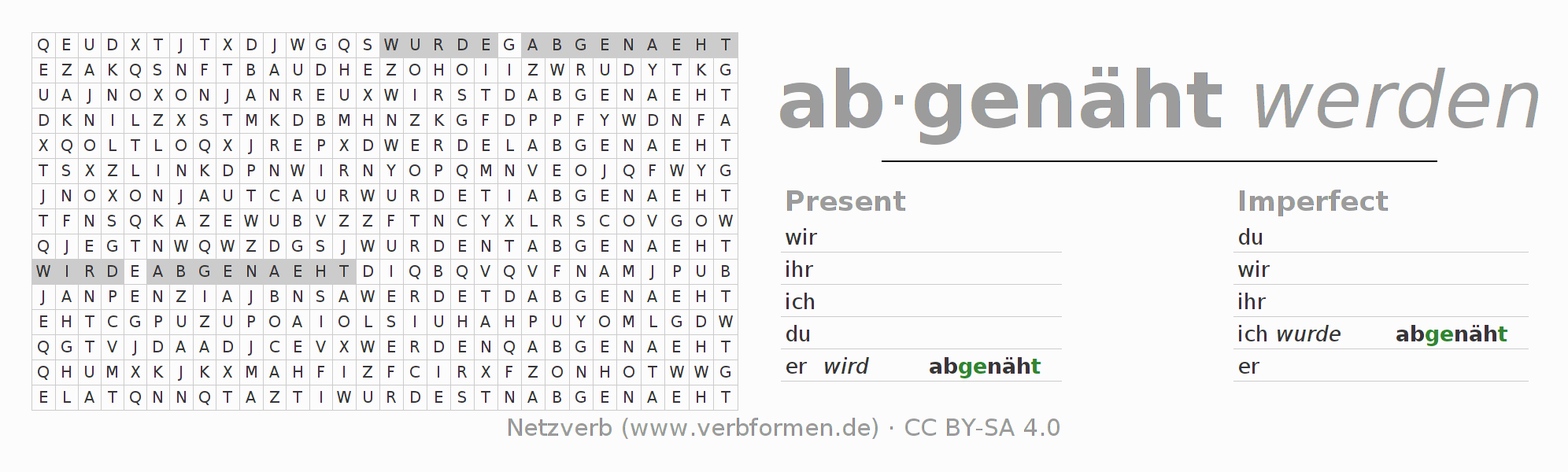 The word search puzzle for abnähen or short word search is used to playfully learn German conjugation. First of all, the individual verb forms of the verb abnähen must be created in order to find them in the letter grid. The reverse way is also possible. If one finds a flected verb in the search word puzzle, it is necessary to find out which verb form can be assigned. For printing and downloading, there is a PDF version or an image. There are also many more worksheets for the verb abnähen. All materials are available as Open Educational Resources (OER) under license CC BY- SA 4.0 and can be used free of charge.