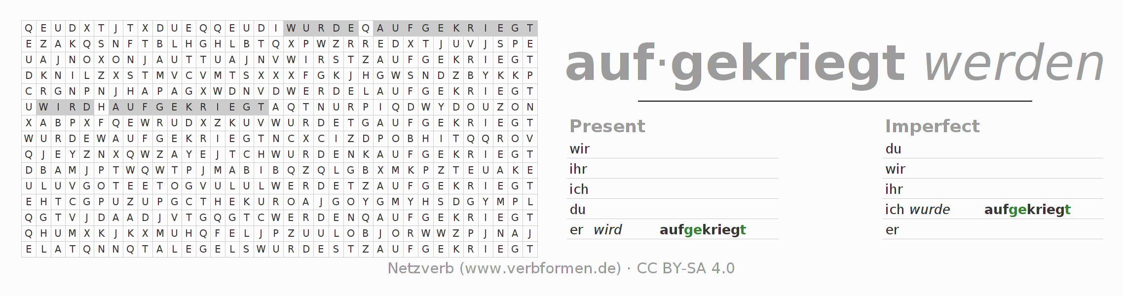 The word search puzzle for aufkriegen or short word search is used to playfully learn German conjugation. First of all, the individual verb forms of the verb aufkriegen must be created in order to find them in the letter grid. The reverse way is also possible. If one finds a flected verb in the search word puzzle, it is necessary to find out which verb form can be assigned. For printing and downloading, there is a PDF version or an image. There are also many more worksheets for the verb aufkriegen. All materials are available as Open Educational Resources (OER) under license CC BY- SA 4.0 and can be used free of charge.