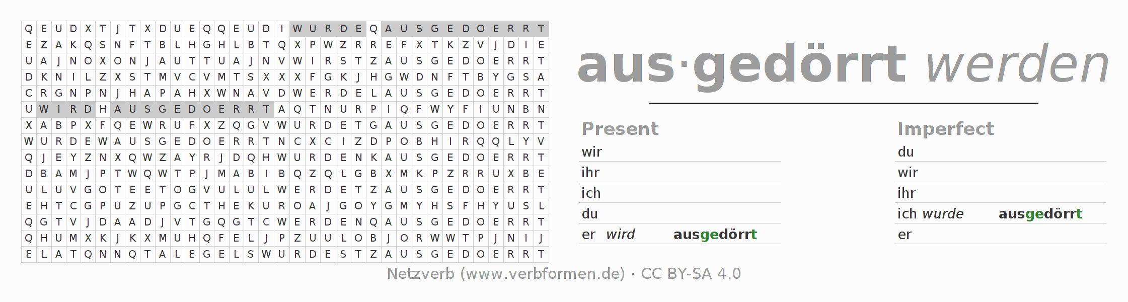The word search puzzle for ausdörren or short word search is used to playfully learn German conjugation. First of all, the individual verb forms of the verb ausdörren (ist) must be created in order to find them in the letter grid. The reverse way is also possible. If one finds a flected verb in the search word puzzle, it is necessary to find out which verb form can be assigned. For printing and downloading, there is a PDF version or an image. There are also many more worksheets for the verb ausdörren. All materials are available as Open Educational Resources (OER) under license CC BY- SA 4.0 and can be used free of charge.