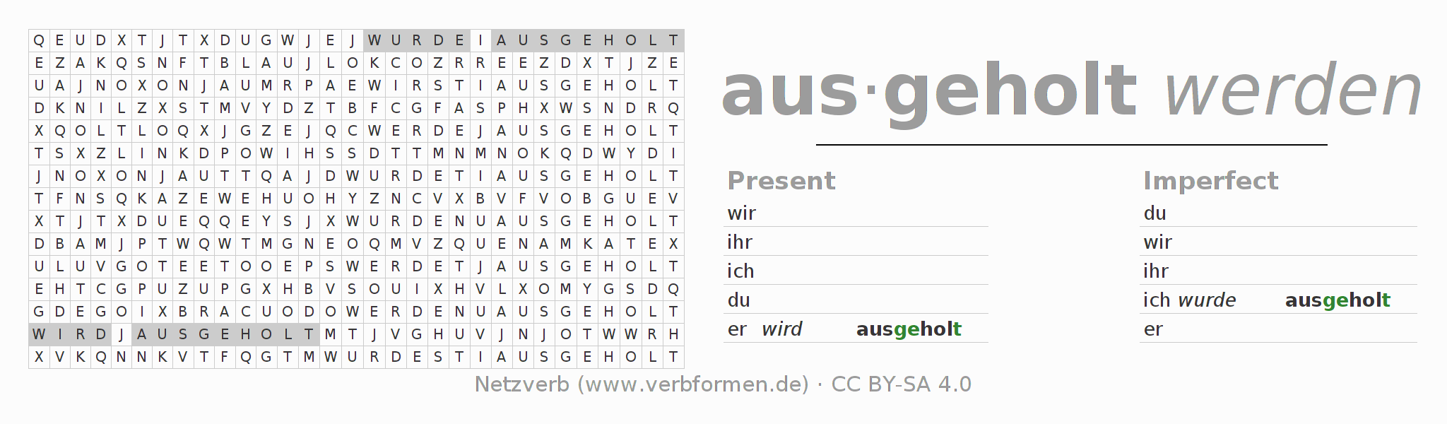 The word search puzzle for ausholen or short word search is used to playfully learn German conjugation. First of all, the individual verb forms of the verb ausholen must be created in order to find them in the letter grid. The reverse way is also possible. If one finds a flected verb in the search word puzzle, it is necessary to find out which verb form can be assigned. For printing and downloading, there is a PDF version or an image. There are also many more worksheets for the verb ausholen. All materials are available as Open Educational Resources (OER) under license CC BY- SA 4.0 and can be used free of charge.