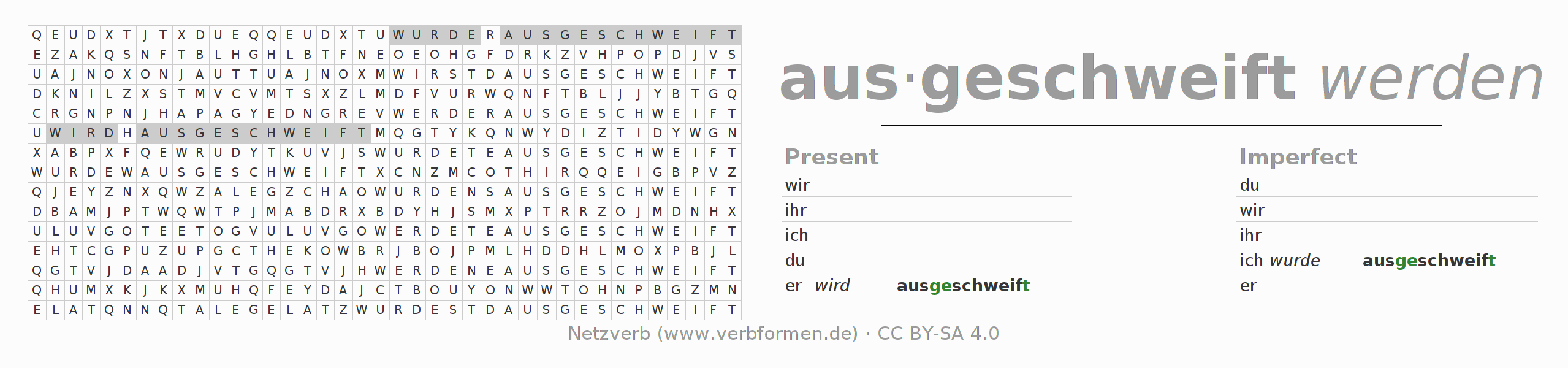 The word search puzzle for ausschweifen or short word search is used to playfully learn German conjugation. First of all, the individual verb forms of the verb ausschweifen (ist) must be created in order to find them in the letter grid. The reverse way is also possible. If one finds a flected verb in the search word puzzle, it is necessary to find out which verb form can be assigned. For printing and downloading, there is a PDF version or an image. There are also many more worksheets for the verb ausschweifen. All materials are available as Open Educational Resources (OER) under license CC BY- SA 4.0 and can be used free of charge.