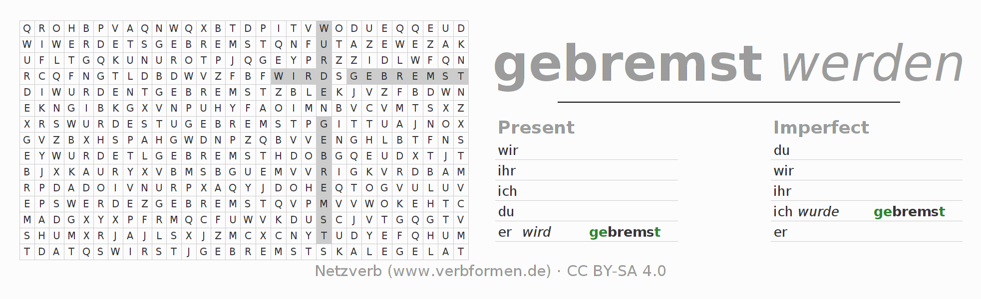 Instruction: Form the verb bremsen and find it in the puzzle. Or recognize the flected form of bremsen in the riddle and assign it to the correct verb form. Umlauts and ß are described as oe, ae and ue an ss.The solution is at the bottom of the page.