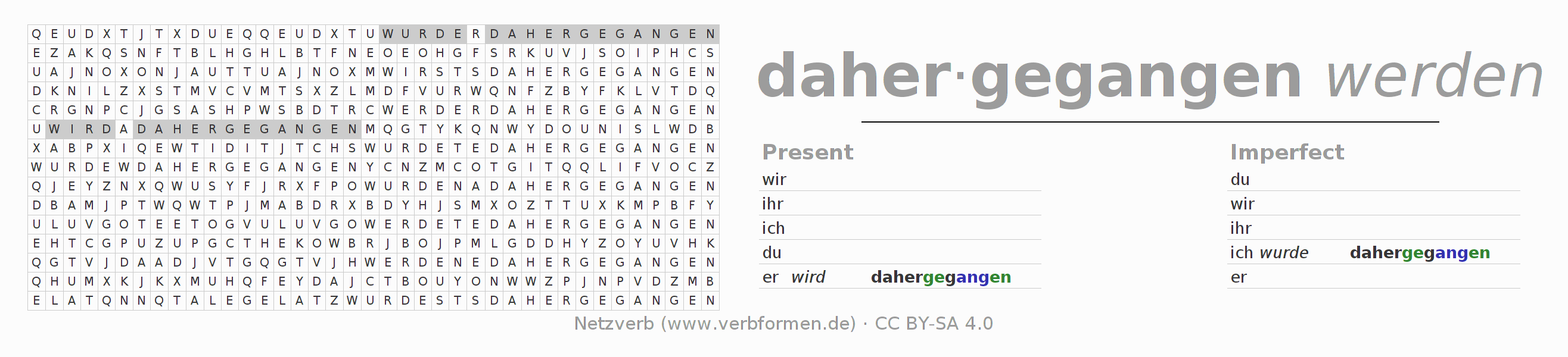 The word search puzzle for dahergehen or short word search is used to playfully learn German conjugation. First of all, the individual verb forms of the verb dahergehen must be created in order to find them in the letter grid. The reverse way is also possible. If one finds a flected verb in the search word puzzle, it is necessary to find out which verb form can be assigned. For printing and downloading, there is a PDF version or an image. There are also many more worksheets for the verb dahergehen. All materials are available as Open Educational Resources (OER) under license CC BY- SA 4.0 and can be used free of charge.