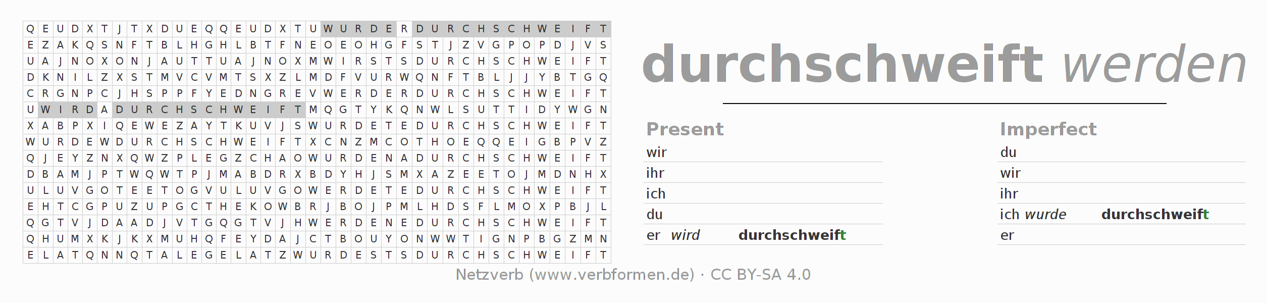 The word search puzzle for durchschweifen or short word search is used to playfully learn German conjugation. First of all, the individual verb forms of the verb durchschweifen must be created in order to find them in the letter grid. The reverse way is also possible. If one finds a flected verb in the search word puzzle, it is necessary to find out which verb form can be assigned. For printing and downloading, there is a PDF version or an image. There are also many more worksheets for the verb durchschweifen. All materials are available as Open Educational Resources (OER) under license CC BY- SA 4.0 and can be used free of charge.
