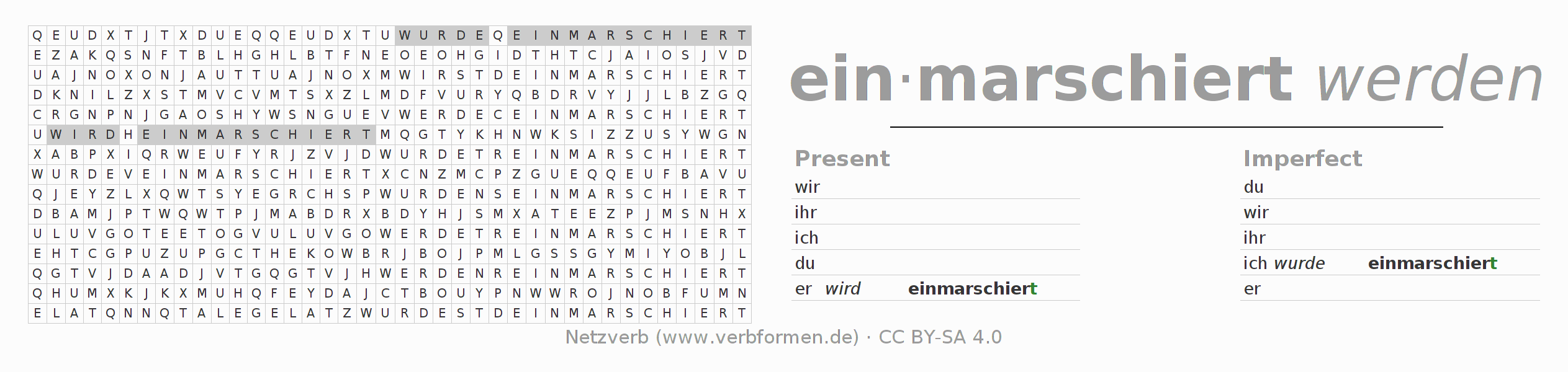 The word search puzzle for einmarschieren or short word search is used to playfully learn German conjugation. First of all, the individual verb forms of the verb einmarschieren must be created in order to find them in the letter grid. The reverse way is also possible. If one finds a flected verb in the search word puzzle, it is necessary to find out which verb form can be assigned. For printing and downloading, there is a PDF version or an image. There are also many more worksheets for the verb einmarschieren. All materials are available as Open Educational Resources (OER) under license CC BY- SA 4.0 and can be used free of charge.