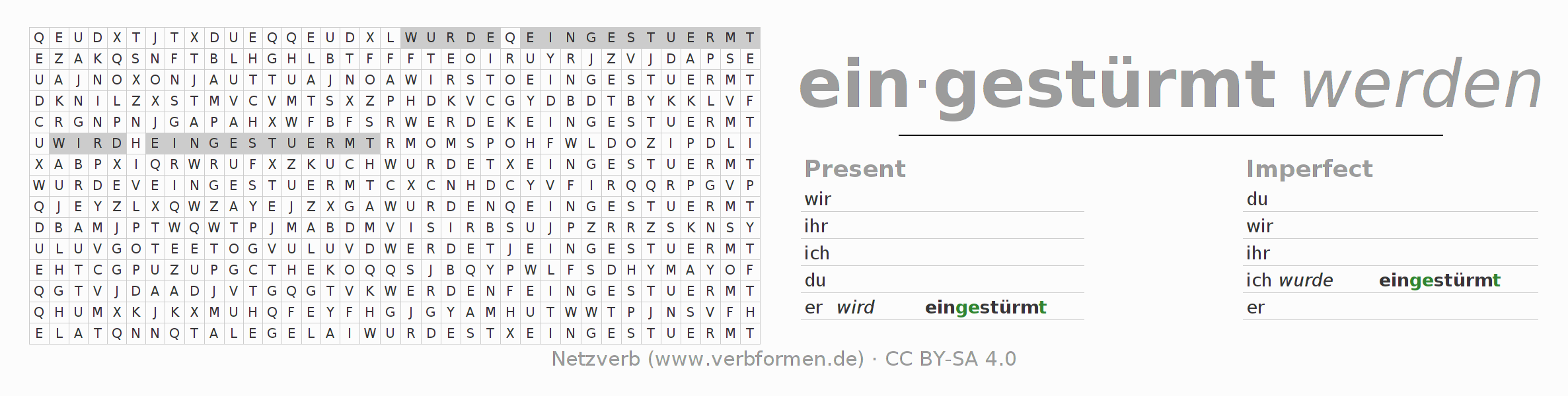 The word search puzzle for einstürmen or short word search is used to playfully learn German conjugation. First of all, the individual verb forms of the verb einstürmen must be created in order to find them in the letter grid. The reverse way is also possible. If one finds a flected verb in the search word puzzle, it is necessary to find out which verb form can be assigned. For printing and downloading, there is a PDF version or an image. There are also many more worksheets for the verb einstürmen. All materials are available as Open Educational Resources (OER) under license CC BY- SA 4.0 and can be used free of charge.