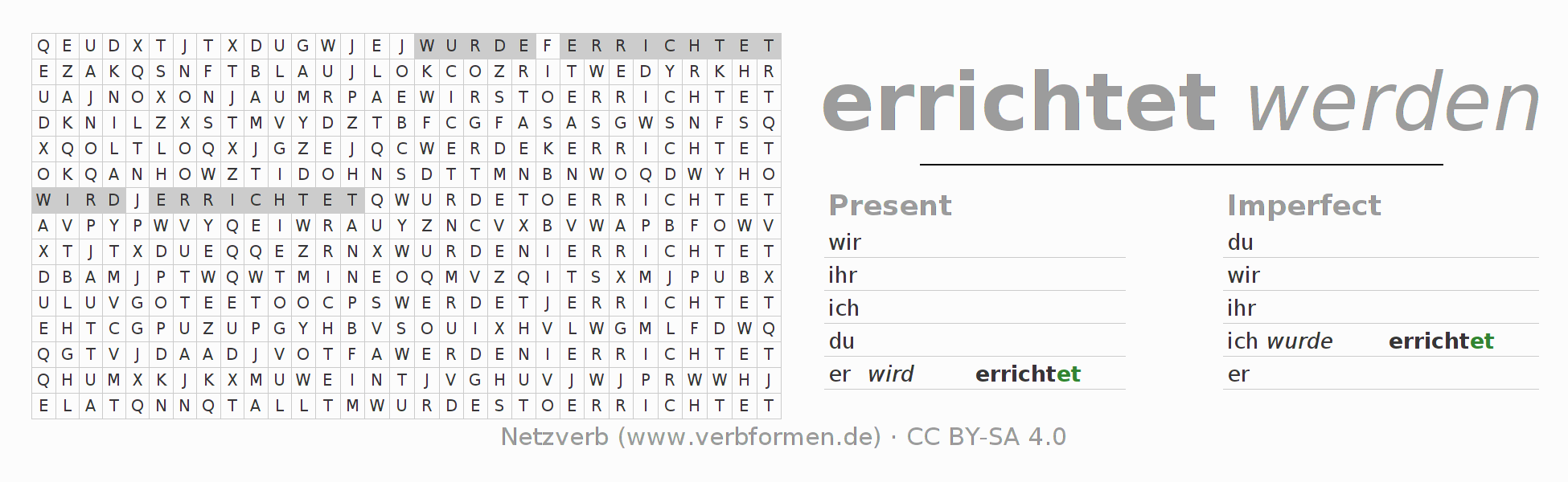 Word search puzzle for the conjugation of the German verb errichten