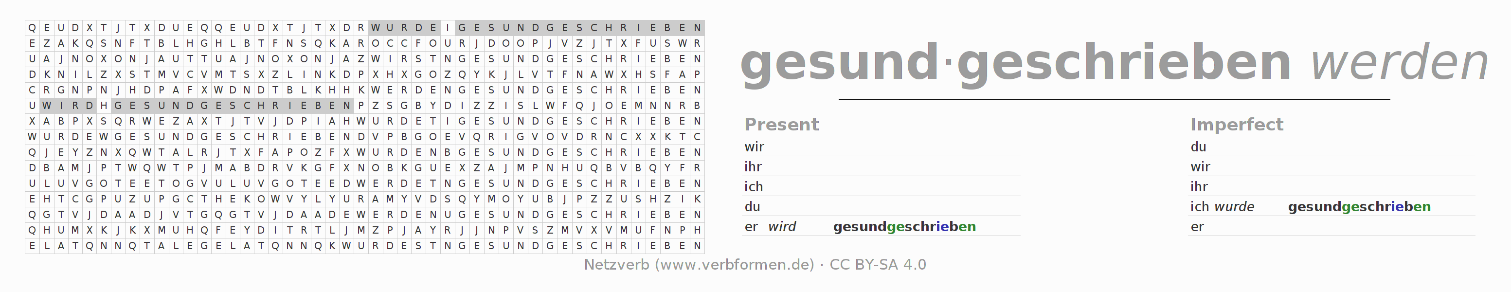 Word search puzzle for the conjugation of the German verb gesundschreiben