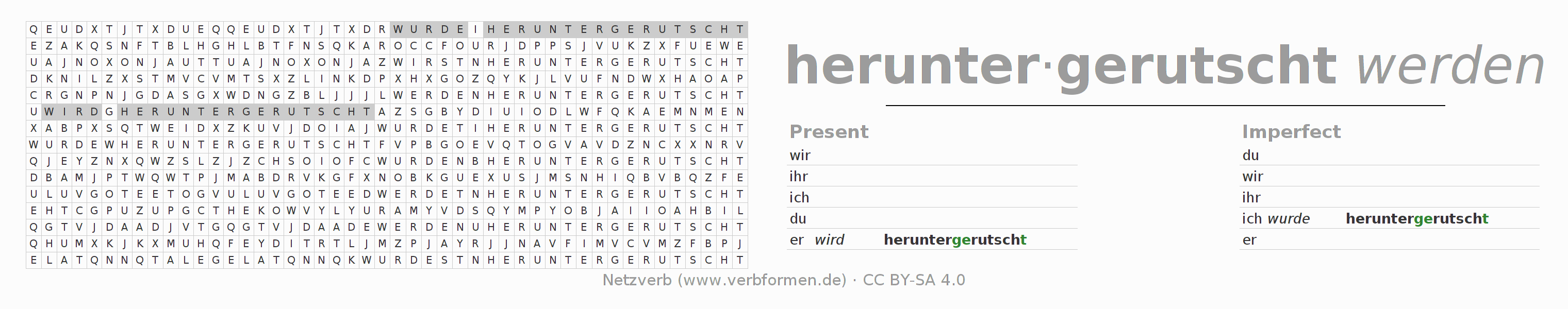 The word search puzzle for herunterrutschen or short word search is used to playfully learn German conjugation. First of all, the individual verb forms of the verb herunterrutschen must be created in order to find them in the letter grid. The reverse way is also possible. If one finds a flected verb in the search word puzzle, it is necessary to find out which verb form can be assigned. For printing and downloading, there is a PDF version or an image. There are also many more worksheets for the verb herunterrutschen. All materials are available as Open Educational Resources (OER) under license CC BY- SA 4.0 and can be used free of charge.