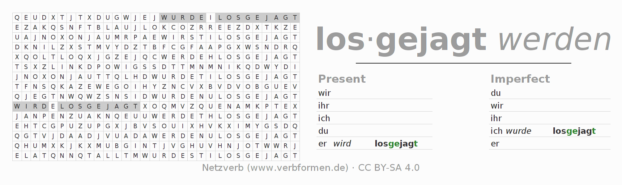 The word search puzzle for losjagen or short word search is used to playfully learn German conjugation. First of all, the individual verb forms of the verb losjagen (hat) must be created in order to find them in the letter grid. The reverse way is also possible. If one finds a flected verb in the search word puzzle, it is necessary to find out which verb form can be assigned. For printing and downloading, there is a PDF version or an image. There are also many more worksheets for the verb losjagen. All materials are available as Open Educational Resources (OER) under license CC BY- SA 4.0 and can be used free of charge.