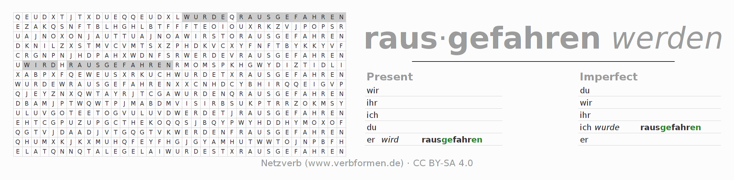 The word search puzzle for rausfahren or short word search is used to playfully learn German conjugation. First of all, the individual verb forms of the verb rausfahren (hat) must be created in order to find them in the letter grid. The reverse way is also possible. If one finds a flected verb in the search word puzzle, it is necessary to find out which verb form can be assigned. For printing and downloading, there is a PDF version or an image. There are also many more worksheets for the verb rausfahren. All materials are available as Open Educational Resources (OER) under license CC BY- SA 4.0 and can be used free of charge.