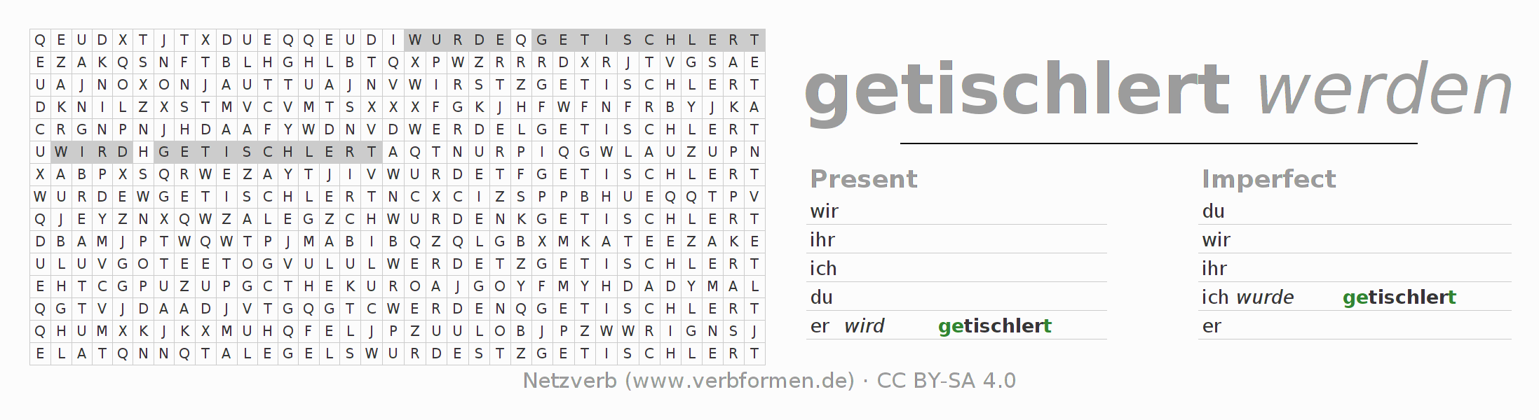 The word search puzzle for tischlern or short word search is used to playfully learn German conjugation. First of all, the individual verb forms of the verb tischlern must be created in order to find them in the letter grid. The reverse way is also possible. If one finds a flected verb in the search word puzzle, it is necessary to find out which verb form can be assigned. For printing and downloading, there is a PDF version or an image. There are also many more worksheets for the verb tischlern. All materials are available as Open Educational Resources (OER) under license CC BY- SA 4.0 and can be used free of charge.