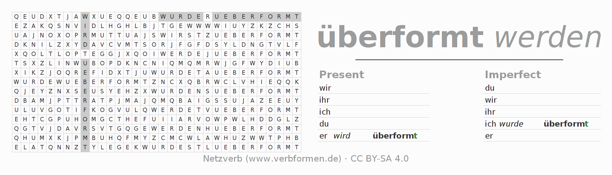The word search puzzle for überformen or short word search is used to playfully learn German conjugation. First of all, the individual verb forms of the verb überformen must be created in order to find them in the letter grid. The reverse way is also possible. If one finds a flected verb in the search word puzzle, it is necessary to find out which verb form can be assigned. For printing and downloading, there is a PDF version or an image. There are also many more worksheets for the verb überformen. All materials are available as Open Educational Resources (OER) under license CC BY- SA 4.0 and can be used free of charge.