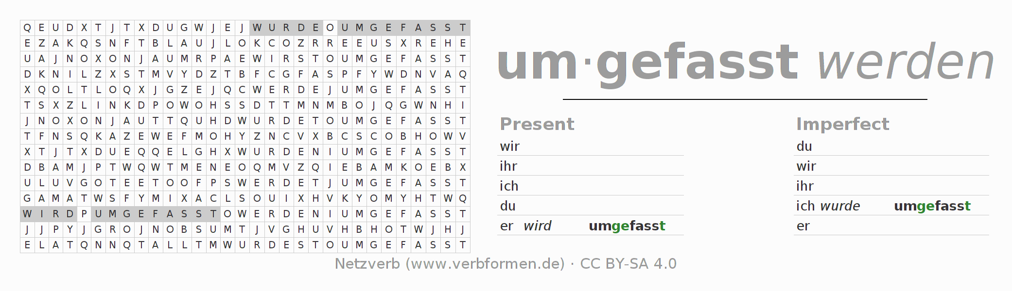 The word search puzzle for umfassen or short word search is used to playfully learn German conjugation. First of all, the individual verb forms of the verb um-fassen must be created in order to find them in the letter grid. The reverse way is also possible. If one finds a flected verb in the search word puzzle, it is necessary to find out which verb form can be assigned. For printing and downloading, there is a PDF version or an image. There are also many more worksheets for the verb umfassen. All materials are available as Open Educational Resources (OER) under license CC BY- SA 4.0 and can be used free of charge.