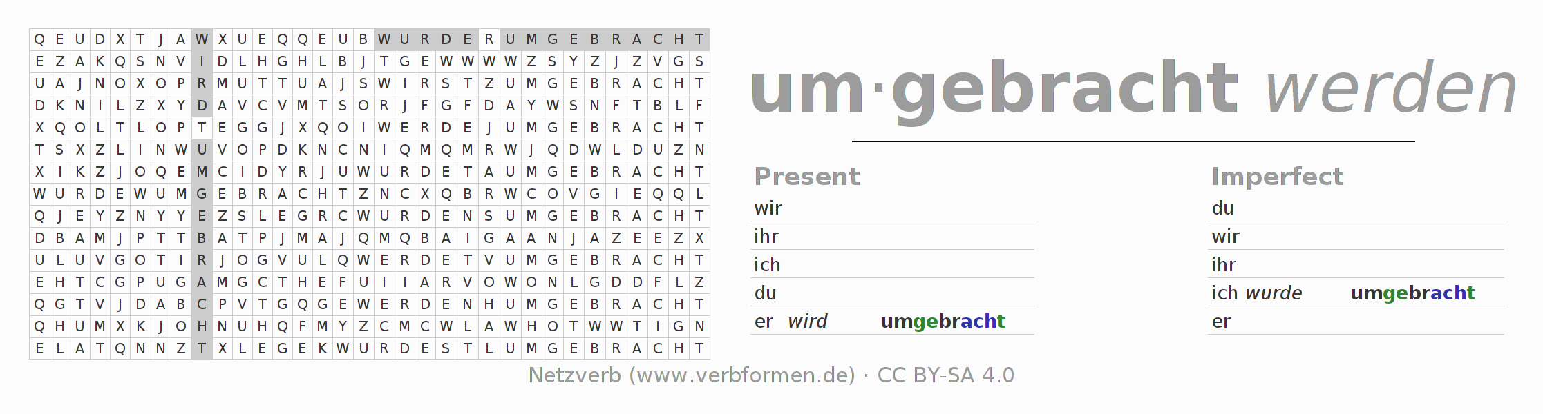 The word search puzzle for umbringen or short word search is used to playfully learn German conjugation. First of all, the individual verb forms of the verb umbringen must be created in order to find them in the letter grid. The reverse way is also possible. If one finds a flected verb in the search word puzzle, it is necessary to find out which verb form can be assigned. For printing and downloading, there is a PDF version or an image. There are also many more worksheets for the verb umbringen. All materials are available as Open Educational Resources (OER) under license CC BY- SA 4.0 and can be used free of charge.