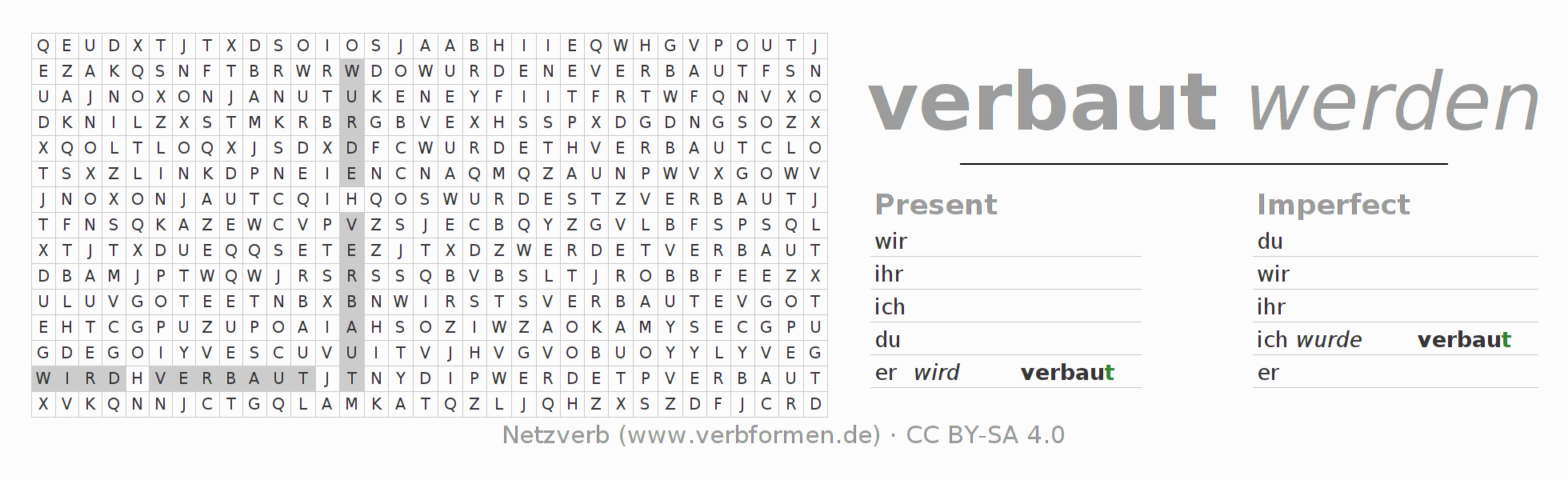 The word search puzzle for verbauen or short word search is used to playfully learn German conjugation. First of all, the individual verb forms of the verb verbauen must be created in order to find them in the letter grid. The reverse way is also possible. If one finds a flected verb in the search word puzzle, it is necessary to find out which verb form can be assigned. For printing and downloading, there is a PDF version or an image. There are also many more worksheets for the verb verbauen. All materials are available as Open Educational Resources (OER) under license CC BY- SA 4.0 and can be used free of charge.