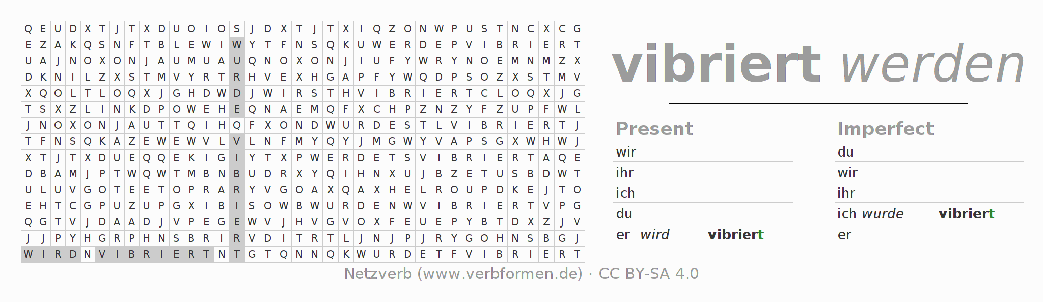 Instruction: Form the verb vibrieren and find it in the puzzle. Or recognize the flected form of vibrieren in the riddle and assign it to the correct verb form. Umlauts and ß are described as oe, ae and ue an ss.The solution is at the bottom of the page.