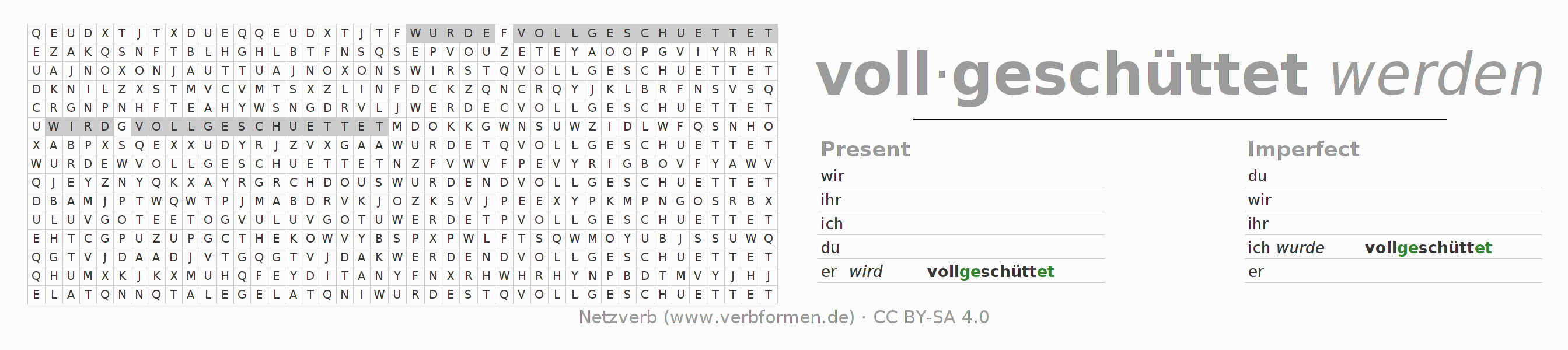 Instruction: Form the verb vollschütten and find it in the puzzle. Or recognize the flected form of vollschütten in the riddle and assign it to the correct verb form. Umlauts and ß are described as oe, ae and ue an ss.The solution is at the bottom of the page.