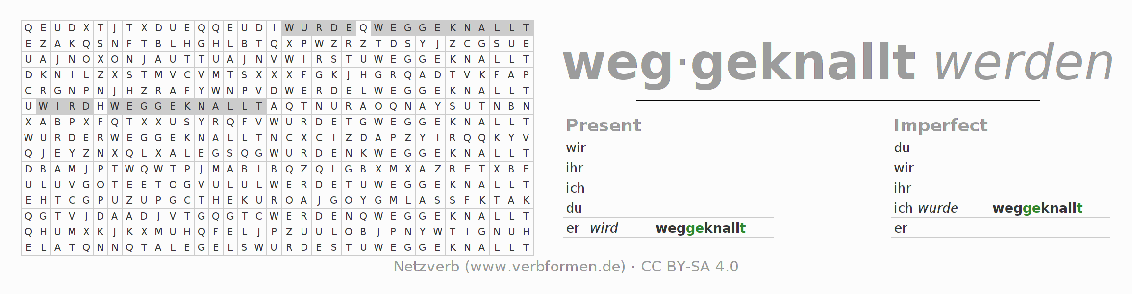 The word search puzzle for wegknallen or short word search is used to playfully learn German conjugation. First of all, the individual verb forms of the verb wegknallen must be created in order to find them in the letter grid. The reverse way is also possible. If one finds a flected verb in the search word puzzle, it is necessary to find out which verb form can be assigned. For printing and downloading, there is a PDF version or an image. There are also many more worksheets for the verb wegknallen. All materials are available as Open Educational Resources (OER) under license CC BY- SA 4.0 and can be used free of charge.