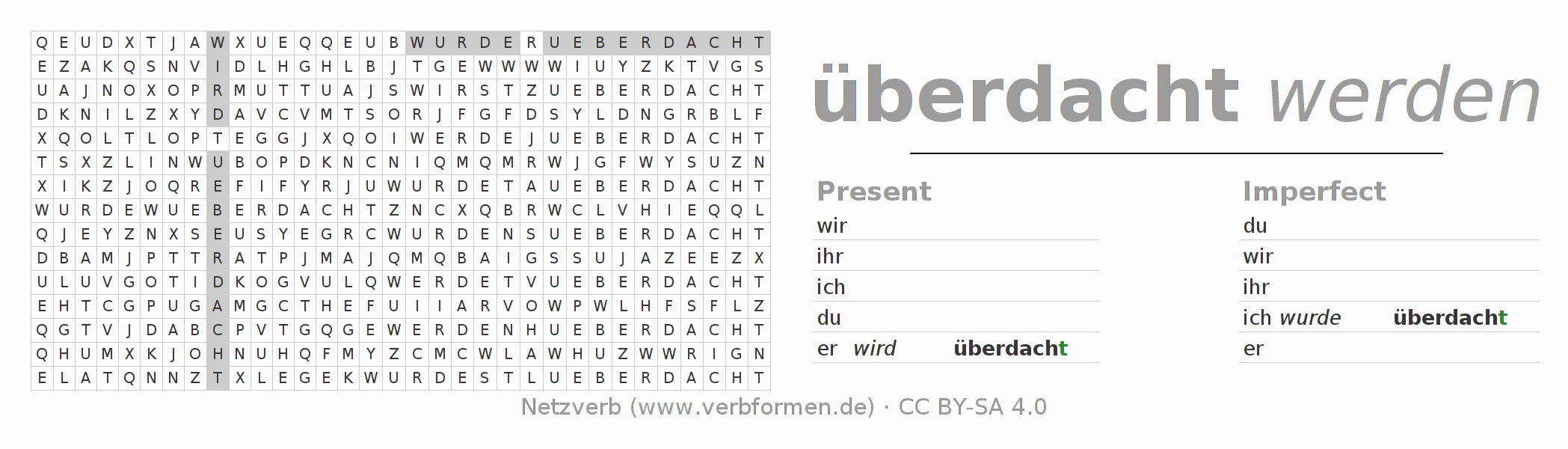The word search puzzle for überdachen or short word search is used to playfully learn German conjugation. First of all, the individual verb forms of the verb überdachen must be created in order to find them in the letter grid. The reverse way is also possible. If one finds a flected verb in the search word puzzle, it is necessary to find out which verb form can be assigned. For printing and downloading, there is a PDF version or an image. There are also many more worksheets for the verb überdachen. All materials are available as Open Educational Resources (OER) under license CC BY- SA 4.0 and can be used free of charge.