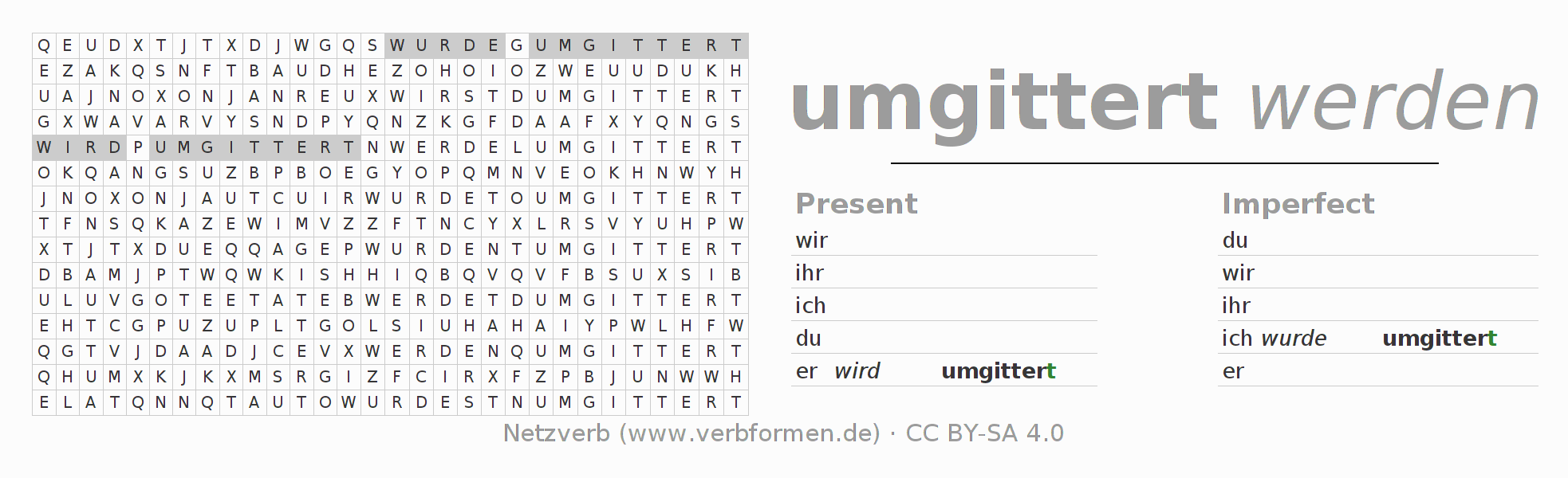 The word search puzzle for umgittern or short word search is used to playfully learn German conjugation. First of all, the individual verb forms of the verb umgittern must be created in order to find them in the letter grid. The reverse way is also possible. If one finds a flected verb in the search word puzzle, it is necessary to find out which verb form can be assigned. For printing and downloading, there is a PDF version or an image. There are also many more worksheets for the verb umgittern. All materials are available as Open Educational Resources (OER) under license CC BY- SA 4.0 and can be used free of charge.