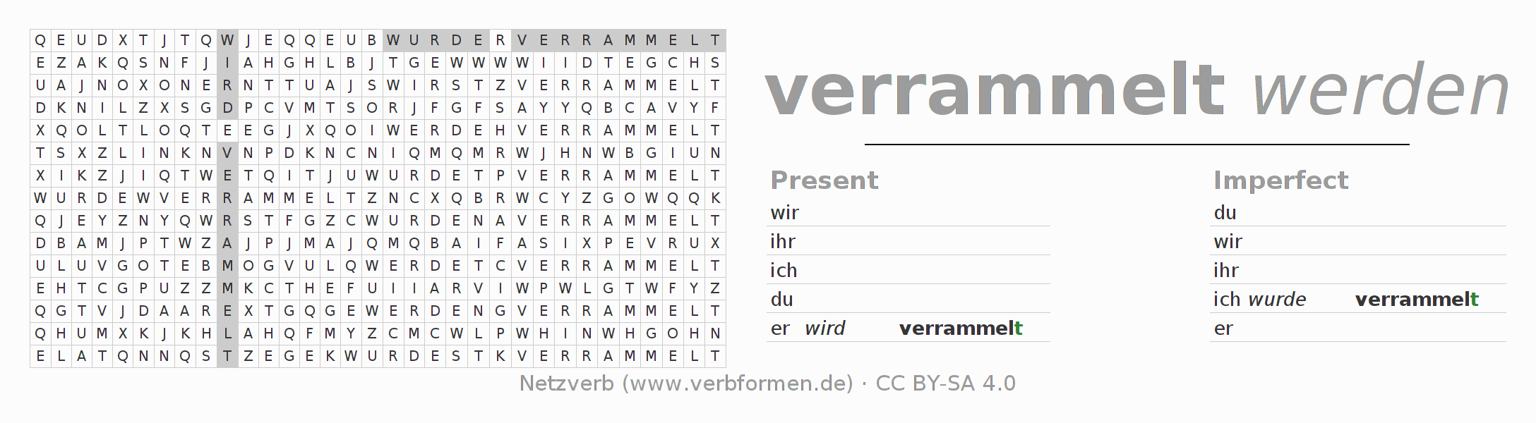 Instruction: Form the verb verrammeln and find it in the puzzle. Or recognize the flected form of verrammeln in the riddle and assign it to the correct verb form. Umlauts and ß are described as oe, ae and ue an ss.The solution is at the bottom of the page.