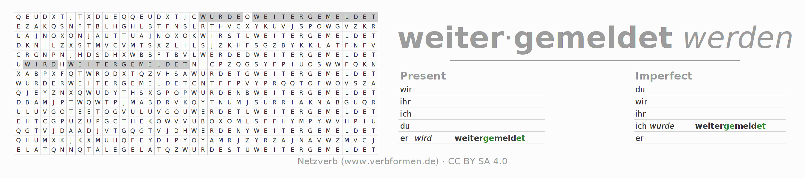 The word search puzzle for weitermelden or short word search is used to playfully learn German conjugation. First of all, the individual verb forms of the verb weitermelden must be created in order to find them in the letter grid. The reverse way is also possible. If one finds a flected verb in the search word puzzle, it is necessary to find out which verb form can be assigned. For printing and downloading, there is a PDF version or an image. There are also many more worksheets for the verb weitermelden. All materials are available as Open Educational Resources (OER) under license CC BY- SA 4.0 and can be used free of charge.
